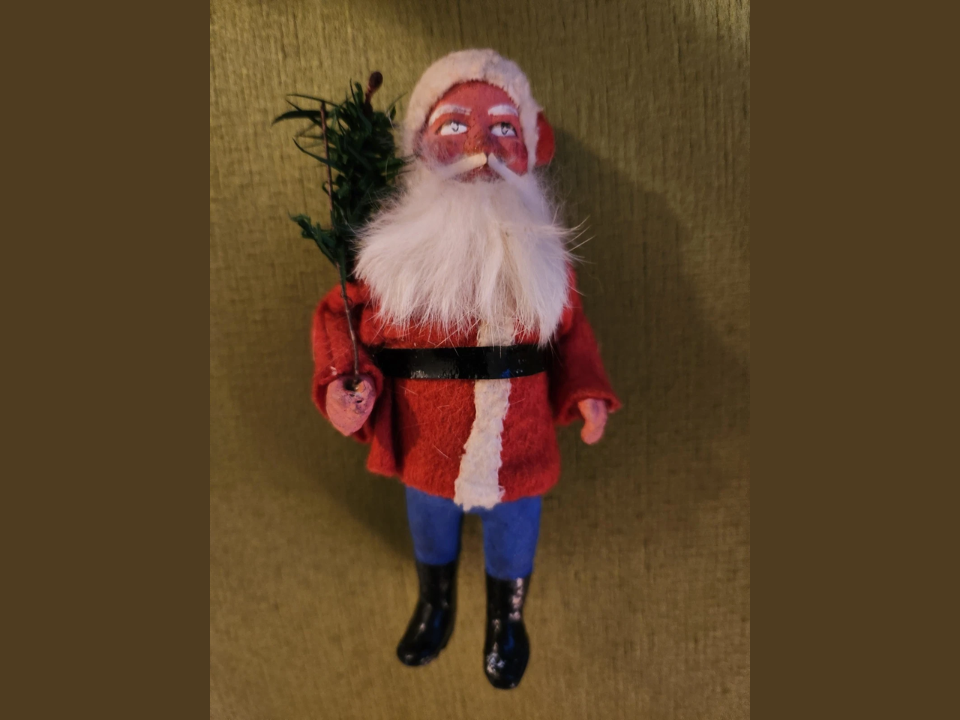 Os Papais Noéis de papel machê alemão servem tanto como decoração quanto como caixas de guloseimas, o que os torna peças de exibição charmosas hoje. Essas figuras geralmente são separadas na cintura ou sob o casaco para que a metade inferior possa conter pequenos doces. Muitos datam do início do século XX e apresentam rostos pintados à mão, barbas de algodão e pequenos acessórios de penas ou galhos.