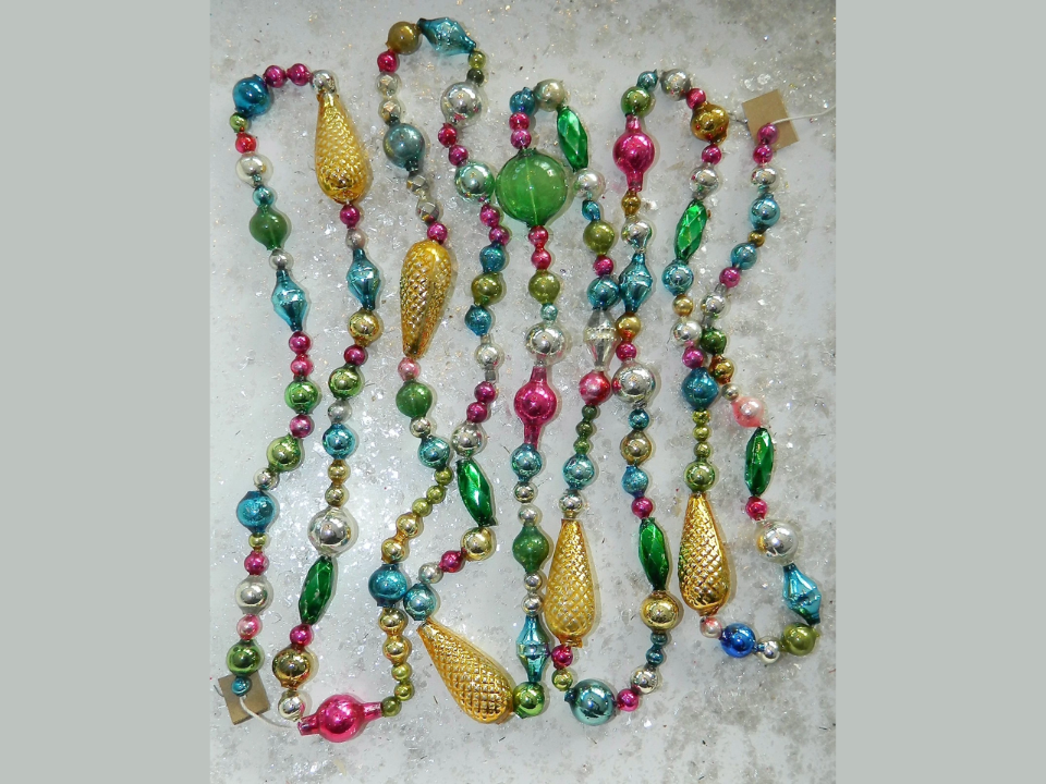 Guirlandas de contas de vidro de mercúrio cobrem árvores e cornijas com um brilho do velho mundo que é difícil de combinar com enfeites mais recentes. Esses fios foram populares desde o final do século XIX até o início do século XX, especialmente entre os fabricantes alemães. As contas podem ser minúsculas e uniformes ou em formato de sinos, lanternas ou pequenas frutas enfiadas em um barbante de algodão. Os colecionadores verificam se há contas faltando ou quebradas e se há cordas que ainda são fortes o suficiente para serem penduradas com segurança.