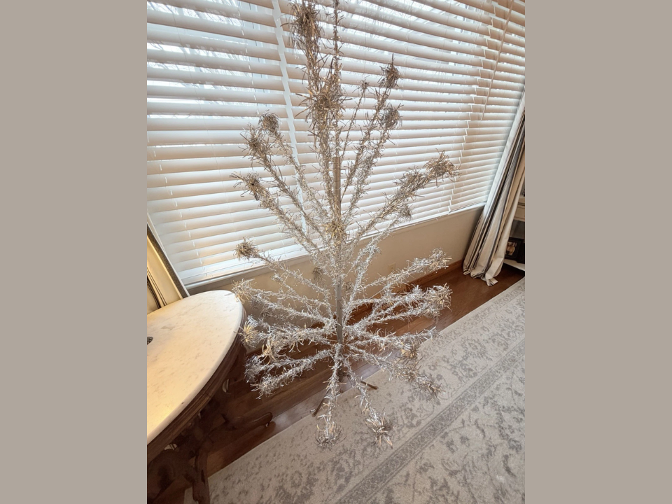 As árvores de Natal de alumínio de meados do século ainda são uma peça central em muitas casas com tema vintage durante as férias. Essas árvores se tornaram populares nas décadas de 1950 e 1960, com galhos de metal cintilantes que refletem as luzes coloridas colocadas no chão. Por serem metálicos, os colecionadores não penduram luzes elétricas diretamente neles e, em vez disso, focam nos enfeites coloridos e naquela roda de cores giratória.