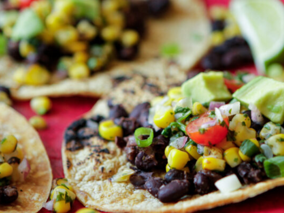 Prepare 1 lata de feijão preto escorrido e enxaguado, 1 xícara e meia de milho congelado ou enlatado, 1 pimentão picado, 1 cebola pequena picada, 1 colher de sopa de óleo neutro, 1 colher de chá de pimenta em pó, 1 colher de chá de cominho em pó, 1 quarto de colher de chá de sal, 2 colheres de sopa de salsa e 1 colher de sopa de suco de limão. Aqueça o azeite em médio-alto e cozinhe a cebola e a pimenta por 4 minutos. Adicione o milho e cozinhe por 2 minutos, depois adicione o feijão, a pimenta em pó, o cominho e o sal e mexa por 2 minutos. Junte o molho e o suco de limão, cozinhe por 1 minuto e sirva com coberturas como queijo ralado ou coentro picado, se tiver.