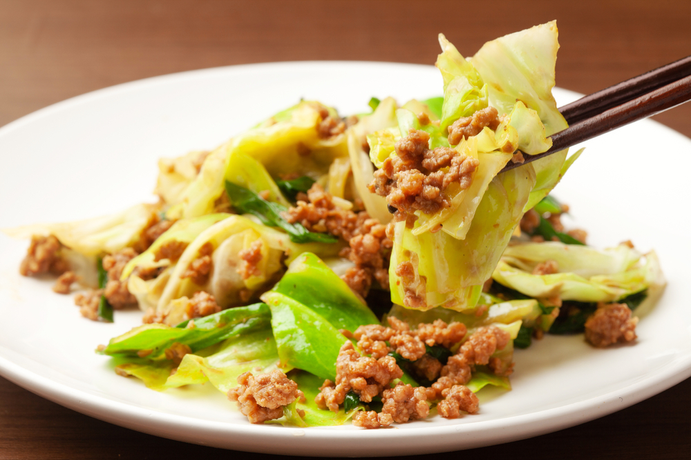 O repolho é um dos melhores vegetais para limpar a geladeira porque cozinha rápido e ainda mantém um pouco de sabor. Este refogado é feito com carne de porco moída e repolho picado, além de quaisquer sobras de cenoura ou cebola que você queira adicionar. A preparação leva cerca de 10 minutos e o cozimento leva de 10 a 12 minutos. É recheado sozinho ou servido com arroz.