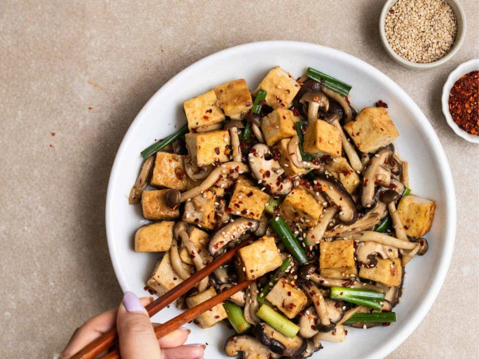 Pegue 14 onças de tofu firme prensado e cortado em cubos, 3 xícaras de cogumelos fatiados, 2 xícaras de espinafre ou verduras picadas, 2 colheres de sopa de molho de soja, 1 colher de sopa de óleo de gergelim, 1 colher de sopa de vinagre de arroz, 1 colher de sopa de mel, 1 colher de chá de gengibre ralado, 2 dentes de alho picados e 1 colher de sopa de óleo neutro. Aqueça o óleo neutro em tofu médio-alto e marrom por 6 a 8 minutos, virando várias vezes. Adicione os cogumelos e cozinhe por 3 minutos, depois adicione as verduras e cozinhe por 1 minuto. Junte o molho de soja, o óleo de gergelim, o vinagre, o mel, o gengibre e o alho, cozinhe por 1 minuto e sirva.