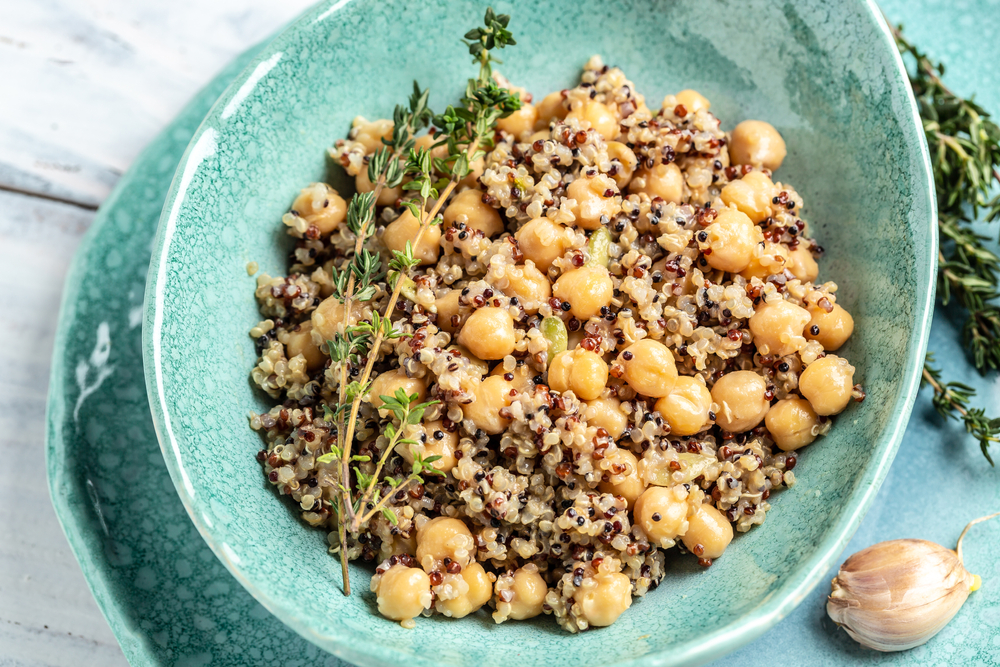 Esta salada de quinoa com grão de bico é farta, rica em proteínas e não precisa ser aquecida. É perfeito tanto para a escola quanto para o trabalho, e os sabores só ficam melhores à medida que assenta. Você pode prepará-lo com antecedência e guardá-lo na geladeira por alguns dias. Os ingredientes são simples e é uma ótima maneira de obter um equilíbrio entre grãos e legumes saudáveis.