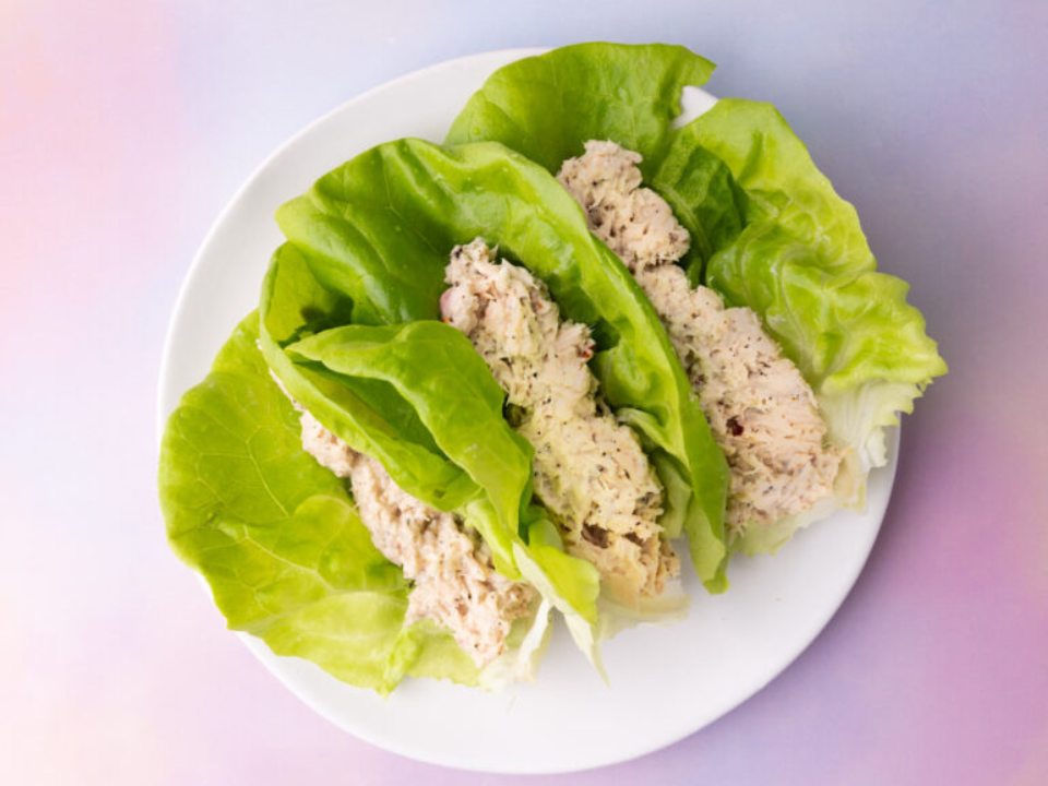 Você vai precisar de 1 lata de atum escorrido, 2 colheres de sopa de maionese, 1 colher de sopa de mostarda e 1 folha de alface romana. Misture o atum escorrido, a maionese e a mostarda em uma tigela até incorporar bem. Coloque a mistura de atum em uma folha de alface romana. Embrulhe e divirta-se. Esta receita simples fica pronta em minutos!