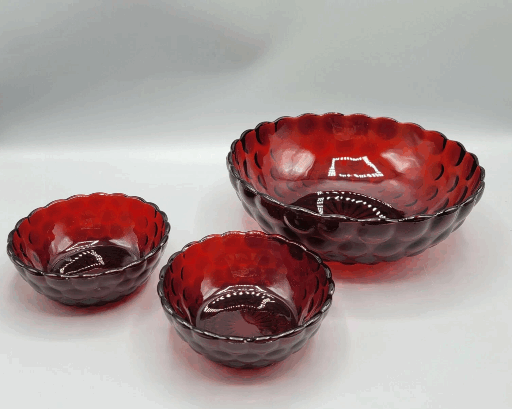 O vidro rubi profundo parece caro porque a cor é rica e o brilho se destaca sob a luz da lâmpada. Muitas peças Royal Ruby foram produzidas de 1938 a 1967. A empresa é Anchor Hocking, e muitas tigelas ou vasos pequenos ainda são vendidos por cerca de US$ 15 a US$ 75 no mercado atual. Parece sofisticado em uma prateleira porque a cor parece vidro especial, mesmo em formatos simples.