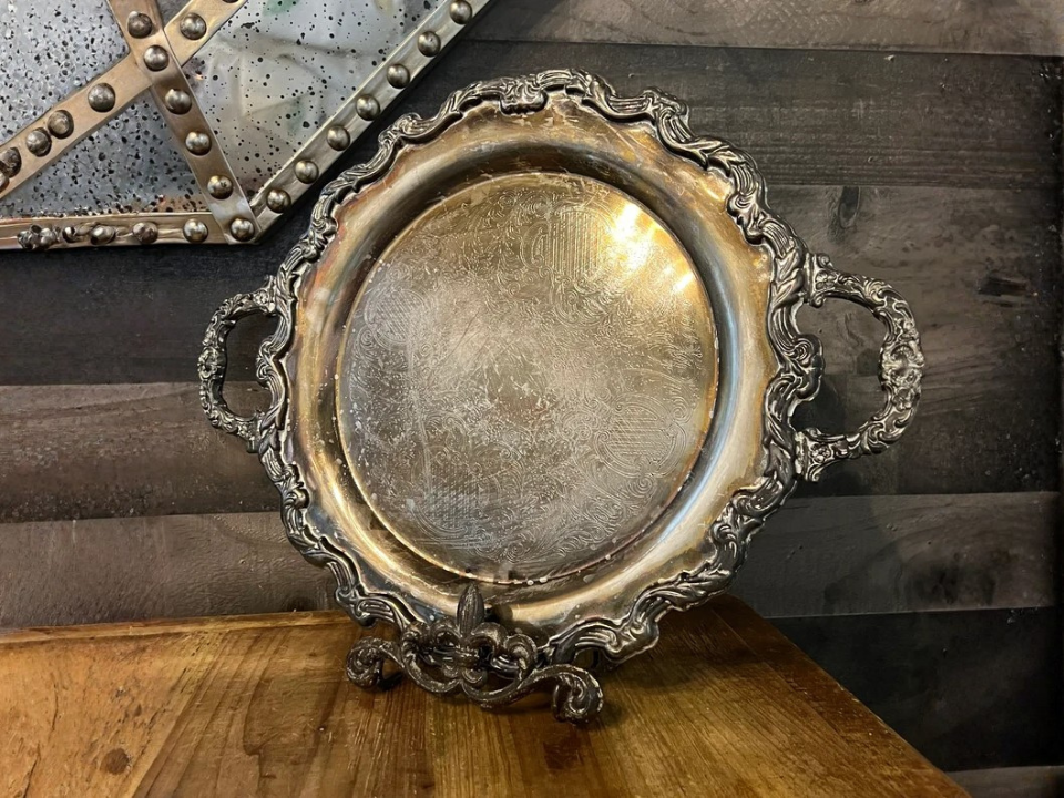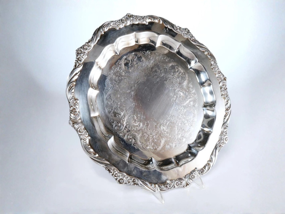 Uma bandeja prateada com brilho suave pode fazer uma prateleira ou mesa de centro parecer muito mais formal do que o preço sugere. Muitas bandejas de prata internacional que você vê hoje foram feitas entre as décadas de 1940 e 1960. O fabricante é a International Silver Company, e um valor atual típico é de cerca de US$ 25 a US$ 120, dependendo do tamanho e do desgaste. Parece caro porque a borda brilhante e os detalhes gravados captam a luz como talheres finos.
