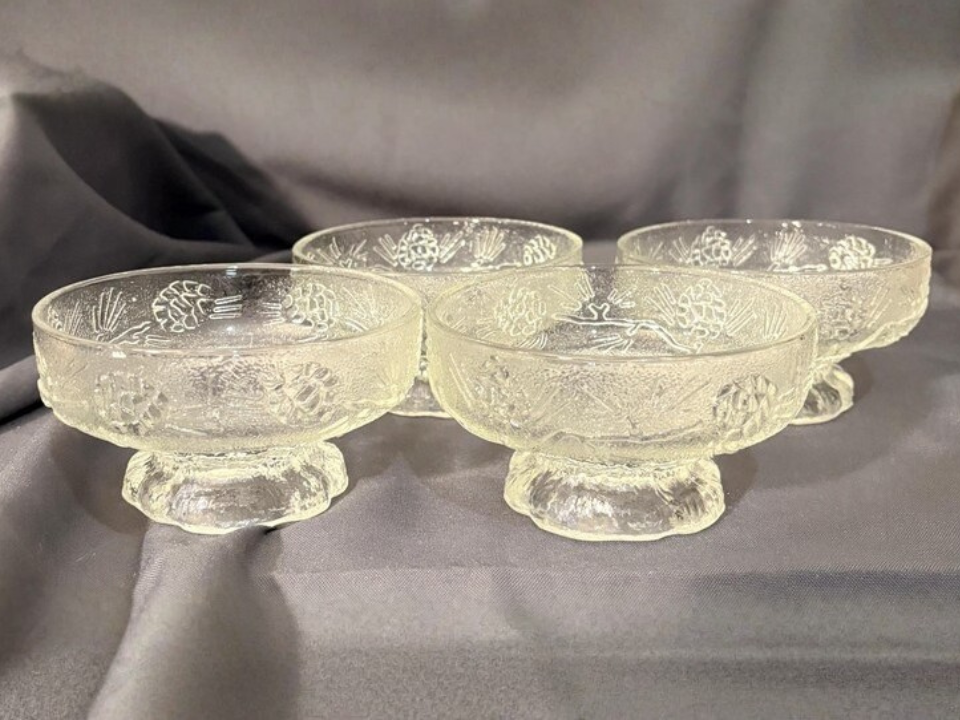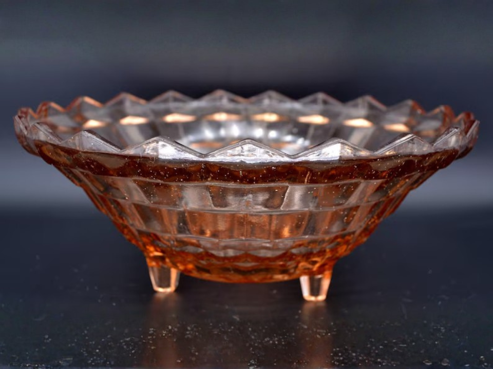 O vidro prensado pode parecer cristal quando o padrão capta a luz da janela. Muitas peças de vidro da era da Depressão foram produzidas entre 1929 e 1939, e a Federal Glass fabricou uma série de itens padronizados nesse período. A empresa é a Federal Glass, e tigelas com pés comuns geralmente custam entre US$ 15 e US$ 70, dependendo da cor e dos chips. Parece caro porque o padrão e o pé adicionam brilho e altura sem a necessidade de uma peça grande.