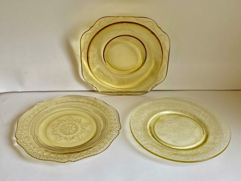 Pratos grandes parecem caros porque ocupam espaço e captam luz em uma superfície ampla. Muitos pratos da era da Depressão foram produzidos entre 1929 e 1939. O fabricante varia de acordo com o padrão, e os pratos comuns ainda custam cerca de US$ 25 a US$ 100, dependendo da cor e da condição. Parece sofisticado quando exibido na vertical, já que o padrão parece arte decorativa.