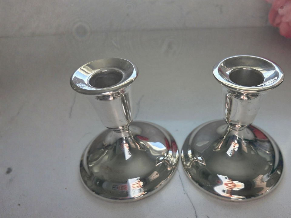 Um par de castiçais combinando pode fazer uma prateleira parecer formal imediatamente. Muitos castiçais de prata internacionais que você encontra hoje foram feitos em meados dos anos 1900, muitas vezes entre os anos 1930 e 1960. O fabricante é a International Silver Company, e muitos pares são vendidos entre US$ 20 e US$ 90, dependendo da altura e do desgaste do revestimento. Eles parecem caros porque a silhueta alta e o brilho parecem peças de sala de jantar de uma época mais formal.