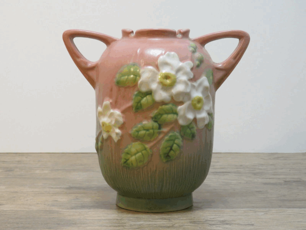 A cerâmica artística muitas vezes parece cara porque o esmalte e a forma parecem uma decoração de galeria. A Roseville Pottery funcionou de 1890 a 1954, com muitas linhas conhecidas feitas do início de 1900 até a década de 1940. A marca é Roseville, e vasos menores às vezes podem ser encontrados por cerca de US$ 75 a US$ 250, dependendo da linha e do estado. Parece sofisticado porque a profundidade do esmalte e os detalhes em relevo parecem mais ricos do que a decoração de massa moderna.