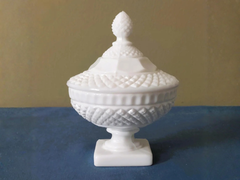 Um prato coberto parece chique porque a tampa faz com que pareça uma peça central. Muitos pratos cobertos com vidro de leite Westmoreland foram feitos entre as décadas de 1920 e 1950. O fabricante é a Westmoreland Glass Company, e muitos exemplos comuns são vendidos hoje por cerca de US$ 20 a US$ 90. Parece caro em exibição porque o vidro branco e a tampa ajustada parecem formais e intencionais.