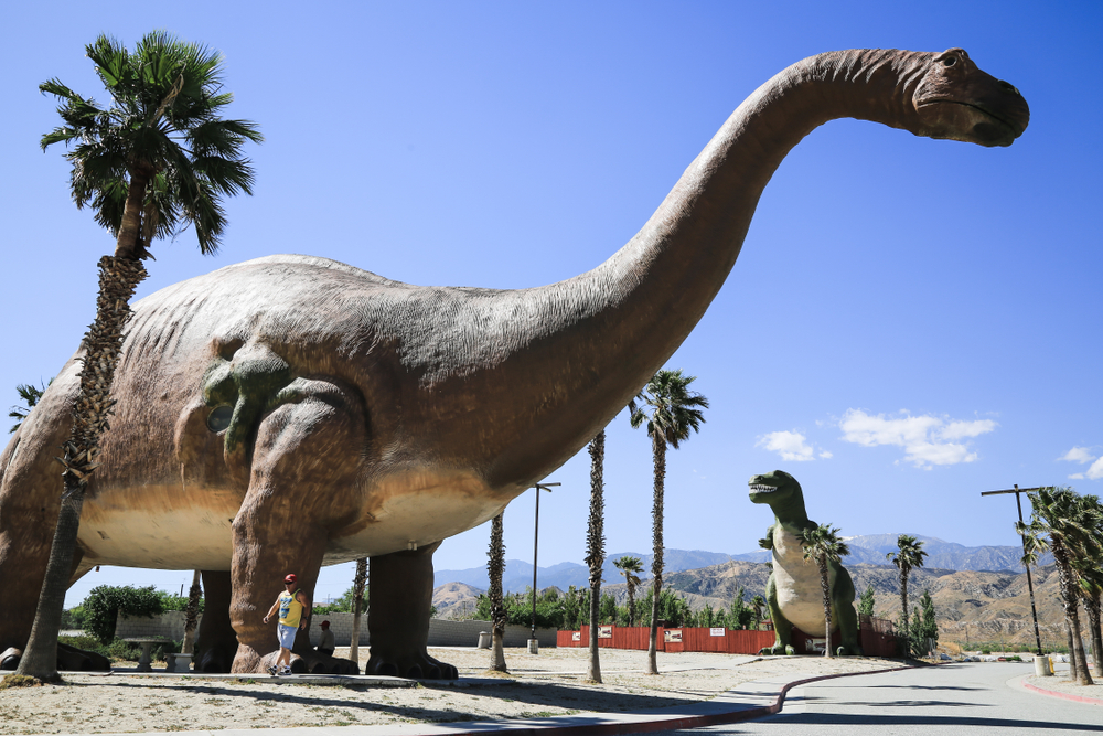 A viagem de San Diego até Palm Springs atravessa uma vasta extensão de deserto que parece muito diferente da costa. Uma das paradas mais famosas ao longo desta rota são os Dinossauros Cabazon. Duas enormes estátuas de dinossauros ficam ao lado da rodovia e rapidamente chamam a atenção das crianças que passam. As famílias costumam parar para tirar fotos e passear pelo local para ver as exibições de perto. A parada divertida ajuda a interromper a longa viagem no deserto.