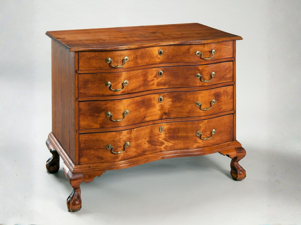 Uma frente serpentina refere-se a uma frente suavemente curvada em forma de S, comumente encontrada em cômodas, mesas e armários antigos do século XVIII. Esta curva elegante adiciona uma aparência fluida e graciosa ao mobiliário, destacando-o dos designs mais simples. Peças com frente serpentina podem valer entre US$ 500 e US$ 10 mil, dependendo do fabricante e do estado. Exemplos bem conservados com linhas claras e hardware original são especialmente valiosos.