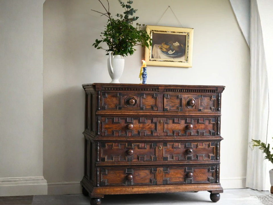 Um baú de carvalho jacobino pode valer entre US$ 1.500 e US$ 5.000, dependendo de sua condição e acabamento. William e John Linnell eram conhecidos por produzir algumas das melhores peças jacobinas. Esses itens são valorizados por seu forte artesanato e conexões históricas, o que os torna a melhor escolha para colecionadores.