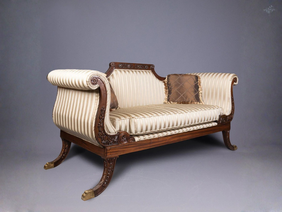 Um sofá de jacarandá estilo Regency pode variar de US$ 3.000 a US$ 7.000, dependendo do acabamento e da condição. Gillows of Lancaster produziu algumas das peças mais icônicas do estilo Regência, conhecidas por seus detalhes finos e design elegante. Os móveis da Regência continuam sendo um estilo altamente colecionável devido à sua conexão com o período da Regência Inglesa e ao seu design limpo e sofisticado.