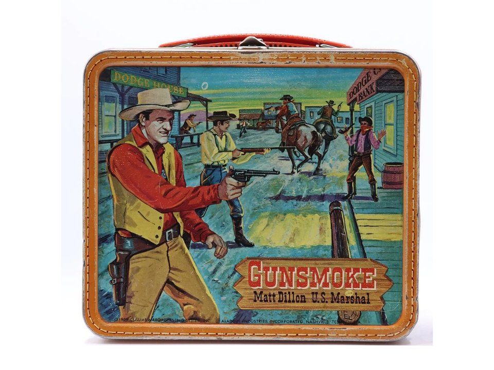 Aladdin produziu uma caixa de Gunsmoke em 1959, mas um erro de impressão em algumas das primeiras peças mostra uma palavra escrita incorretamente que entusiasma os colecionadores. Este erro torna certas variantes raras e interessantes. Uma versão limpa pode mudar de mãos em torno de US$ 1.200 em vendas privadas. Aqueles com o erro e uma garrafa térmica correspondente podem ser ainda mais desejáveis.