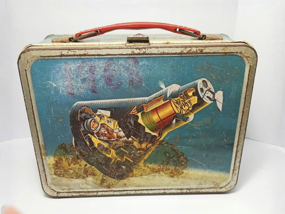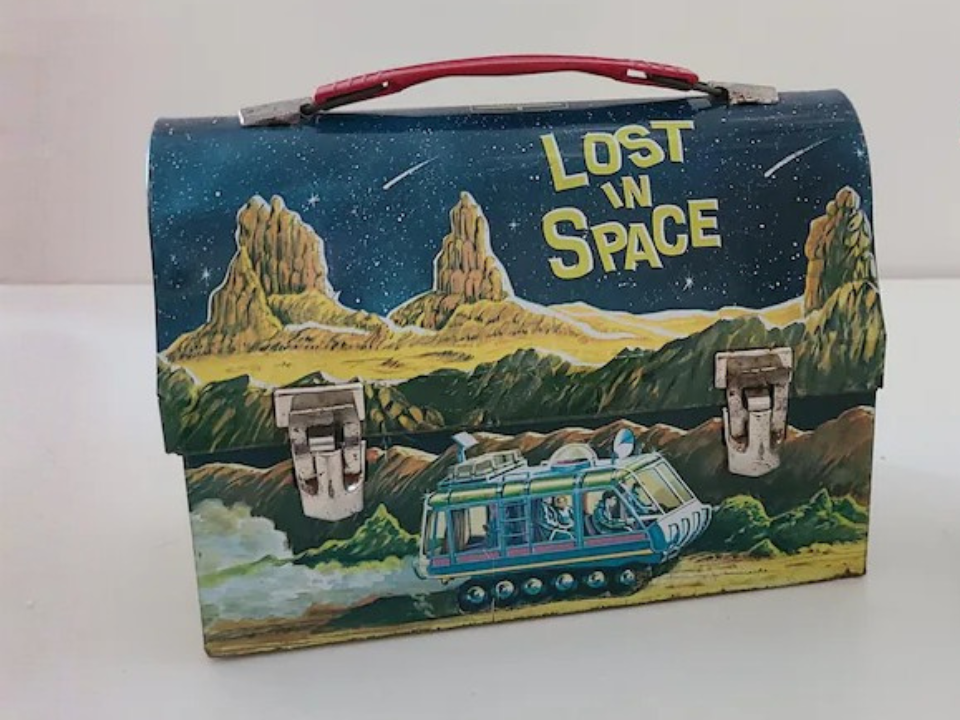 Uma lancheira King-Seeley de 1967 celebrando o programa de ficção científica Lost in Space combina imagens retrô do espaço com um design de caixa de metal. Sua arte lúdica atrai fãs da televisão clássica. Os colecionadores os encontram na faixa de US$ 900 a US$ 1.000 quando estão em bom estado. Peças com garrafas térmicas originais ficam melhor.