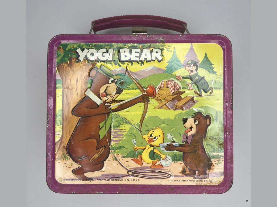 A lancheira Yogi Bear de 1974 de Aladdin traz o personagem de desenho animado em estilo clássico. Os fãs da série nostálgica e da animação vintage adoram este colecionável. Está avaliado entre US$ 50 e US$ 100 dependendo do estado da caixa. Caixas sem ferrugem visível e com impressão legível têm o preço mais alto.