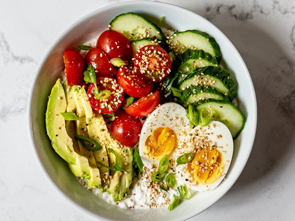 O queijo cottage se transforma em uma mini refeição quando você o trata como uma tigela saborosa em vez de um lanche simples. É rico em proteínas e tem uma textura espessa e cremosa que dá uma sensação de preenchimento. Os tomates acrescentam brilho suculento e o abacate acrescenta riqueza que torna a tigela mais completa. Esta é uma opção rápida quando você deseja algo com sabor fresco, mas ainda satisfatório.