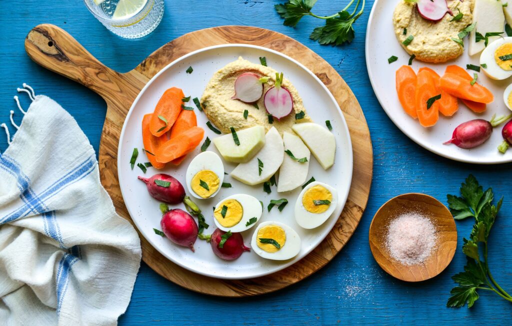 Ovos cozidos com hummus e legumes