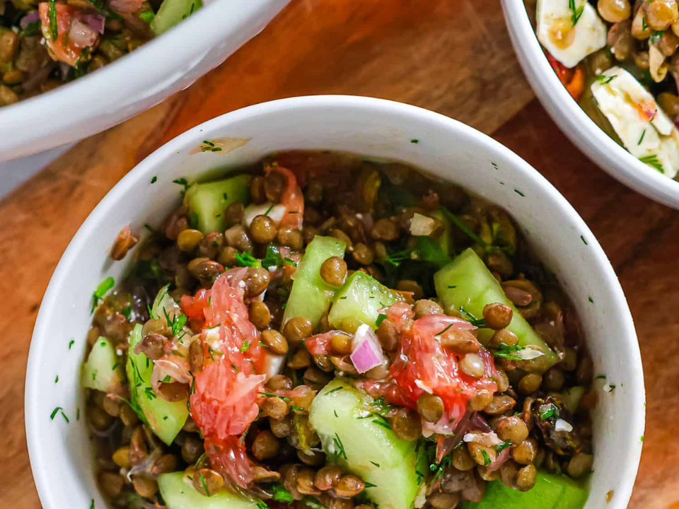 Uma pequena porção de salada de lentilha pode parecer uma mini refeição porque as lentilhas são fartas e fartas. Você obtém proteína vegetal e fibra, o que ajuda a manter a fome afastada por mais tempo. O queijo feta adiciona sabor salgado e as ervas fazem com que tenha um sabor fresco em vez de insípido. Esta também é uma opção fácil de preparar e fica ainda melhor depois de resfriada.