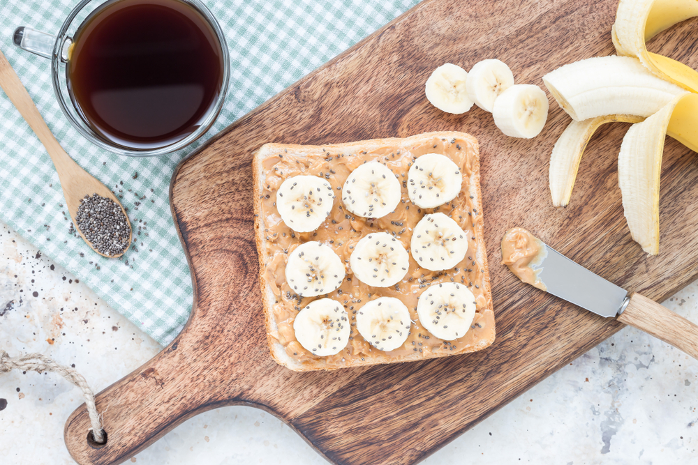 Você precisará de 1 fatia de pão integral, 2 colheres de sopa de manteiga de amendoim, 1 meia banana fatiada e 1 colher de chá de sementes de chia ou sementes de cânhamo. Torre o pão e espalhe a manteiga de amendoim uniformemente nas bordas. Adicione fatias de banana em uma única camada e polvilhe as sementes por cima para ficar crocante. Coma imediatamente e adicione uma pitada de canela se quiser um sabor quente.