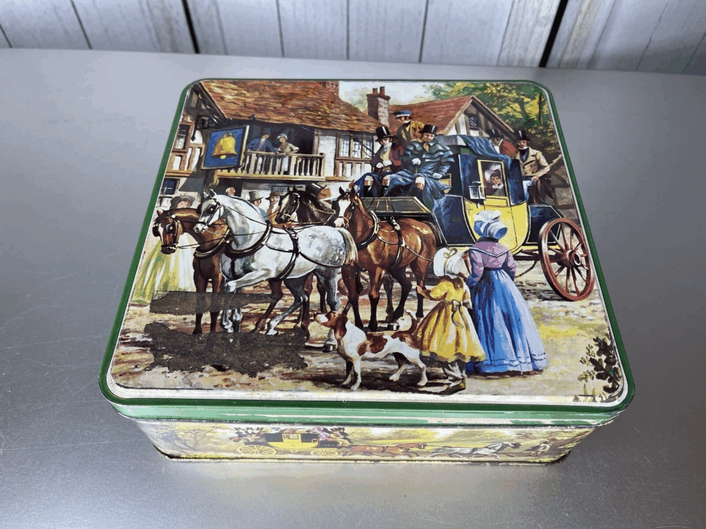 Nas prateleiras da cozinha, a lata Huntley and Palmers Windmill pode roubar a atenção rapidamente. Muitos exemplares são datados por volta de 1924 e o nome da marca geralmente fica claro no corpo. A melhor característica é a cena impressa detalhada combinada com uma tampa que fica confortável quando não foi dobrada. Uma faixa típica de mercado é de US$ 400 a US$ 800 quando os gráficos são limpos e o metal é sólido.