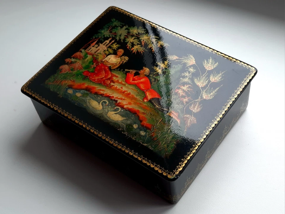 Caixas de laca russa no estilo Palekh são coletadas para cenas de livros de histórias. Muitos foram produzidos em meados de 1900 por oficinas russas, muitas vezes em papel machê com acabamento brilhante. A principal característica é a bela pintura com detalhes dourados e figuras detalhadas. O valor de mercado atual costuma ser de US$ 80 a US$ 400, dependendo do assunto, da assinatura e do desgaste da superfície.