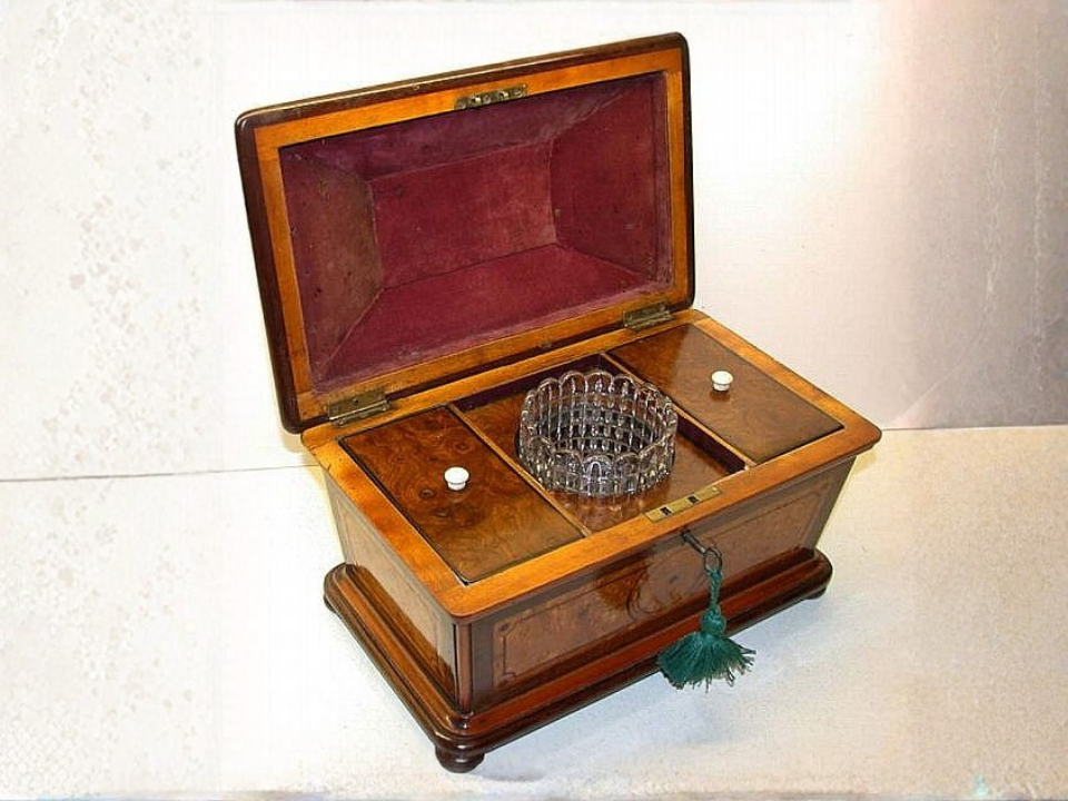 Um transportador de chá de madeira vitoriano pode parecer decorativo e útil. Muitos foram produzidos no final de 1800 por vários fabricantes britânicos, muitas vezes sem uma única grande marca. A característica mais importante é o layout original do compartimento, especialmente quando as divisórias permanecem intactas. O valor de mercado atual costuma ser de US$ 80 a US$ 300, dependendo do tipo de madeira, incrustação, dobradiças e condição.