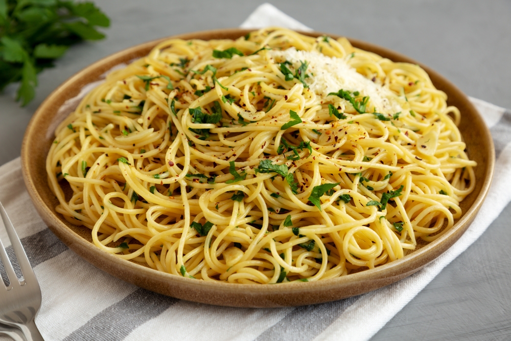 Spaghetti Aglio e Olio é um prato de massa simples, mas saboroso, feito com azeite, alho, pimenta vermelha em flocos e salsa. É rápido de preparar, geralmente leva apenas cerca de 15 minutos do início ao fim. A combinação do alho e do azeite cria uma base rica e saborosa, enquanto a pimenta vermelha acrescenta um calor subtil que torna este prato verdadeiramente satisfatório. É ótimo para um lanche noturno ou um jantar rápido após um dia agitado.