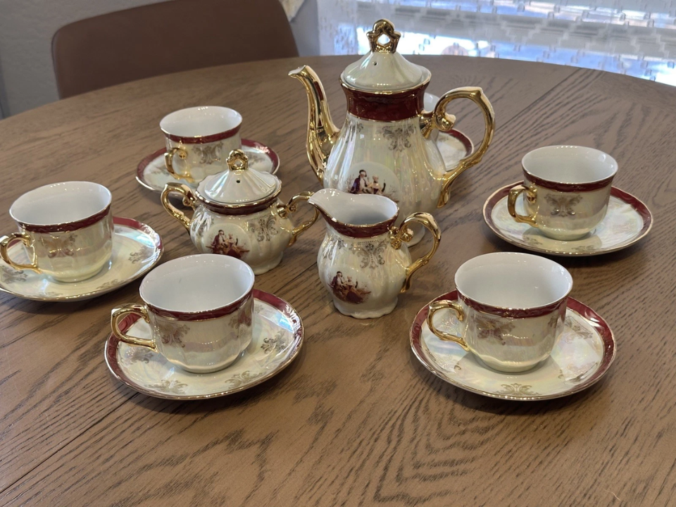 Um jogo de chá vitoriano, completo com bule, xícaras e pires, é um belo exemplo da atenção da época aos detalhes. Muitos conjuntos eram feitos de porcelana ou porcelana e muitas vezes decorados com delicados padrões florais ou detalhes dourados. Esses conjuntos eram essenciais nas casas vitorianas, usados ​​não apenas para o chá, mas também para reuniões sociais e cerimônias.
