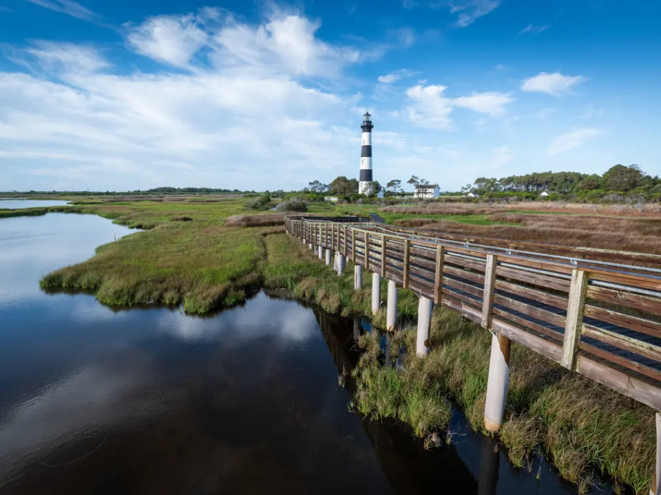 A Bodie Island Light Station, perto de Nags Head, Carolina do Norte, é uma das opções mais agradáveis ​​de Cape Hatteras para pessoas que desejam uma parada no farol e uma caminhada fácil na praia no mesmo dia. Um caminho leva do centro de visitantes ao farol, e um calçadão próximo continua até um deck de observação da vida selvagem próximo a um lago de água doce. Depois disso, a Praia da Coquina fica próxima e um calçadão leva do balneário até a praia. Isso faz com que todo o passeio pareça fácil de organizar, mesmo para uma visita curta.