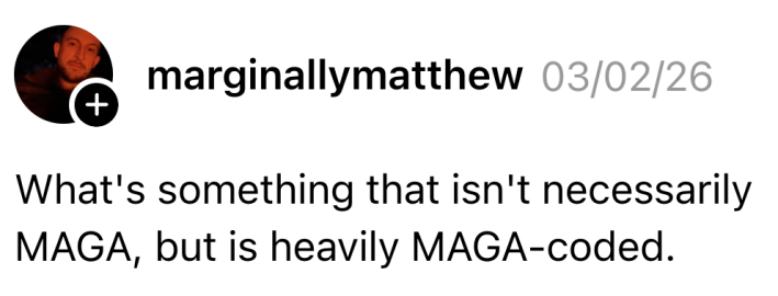 Matthew (@marginallymatthew) estava curioso para saber o que as pessoas pensavam e perguntou no Threads: “O que é algo que não é necessariamente MAGA, mas é fortemente codificado em MAGA.”