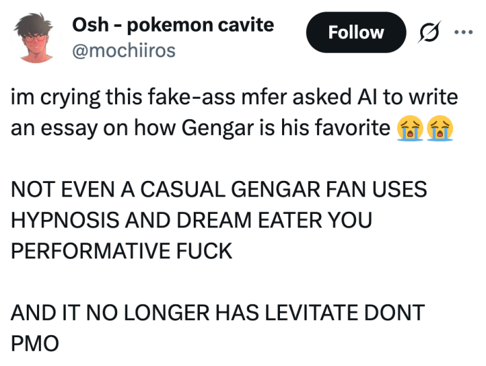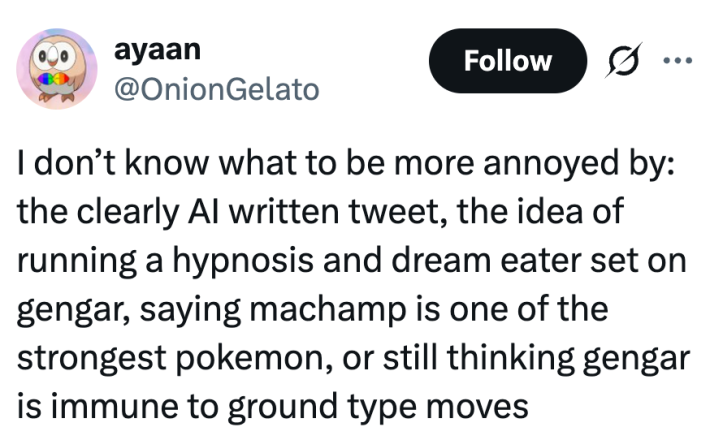 “Não sei com o que ficar mais irritado: o tweet claramente escrito por IA, a ideia de executar uma hipnose e um devorador de sonhos em Gengar, dizer que Machamp é um dos Pokémon mais fortes ou ainda pensar que Gengar é imune a movimentos do tipo terrestre”, escreveu alguém.