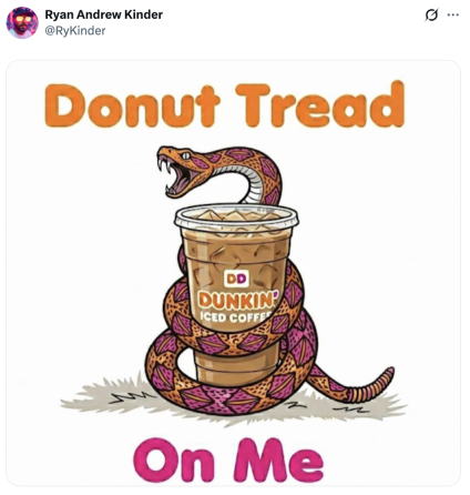 O usuário @RyKinder respondeu a ela com a imagem de uma cobra enrolada em uma bebida semelhante entre as palavras “Donut Tread On Me”.