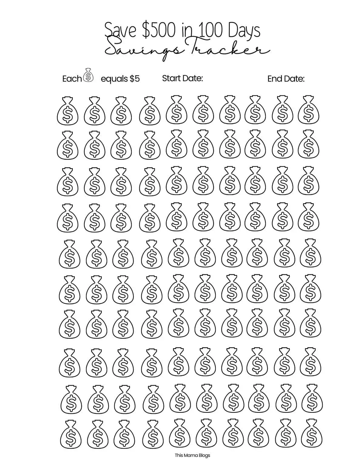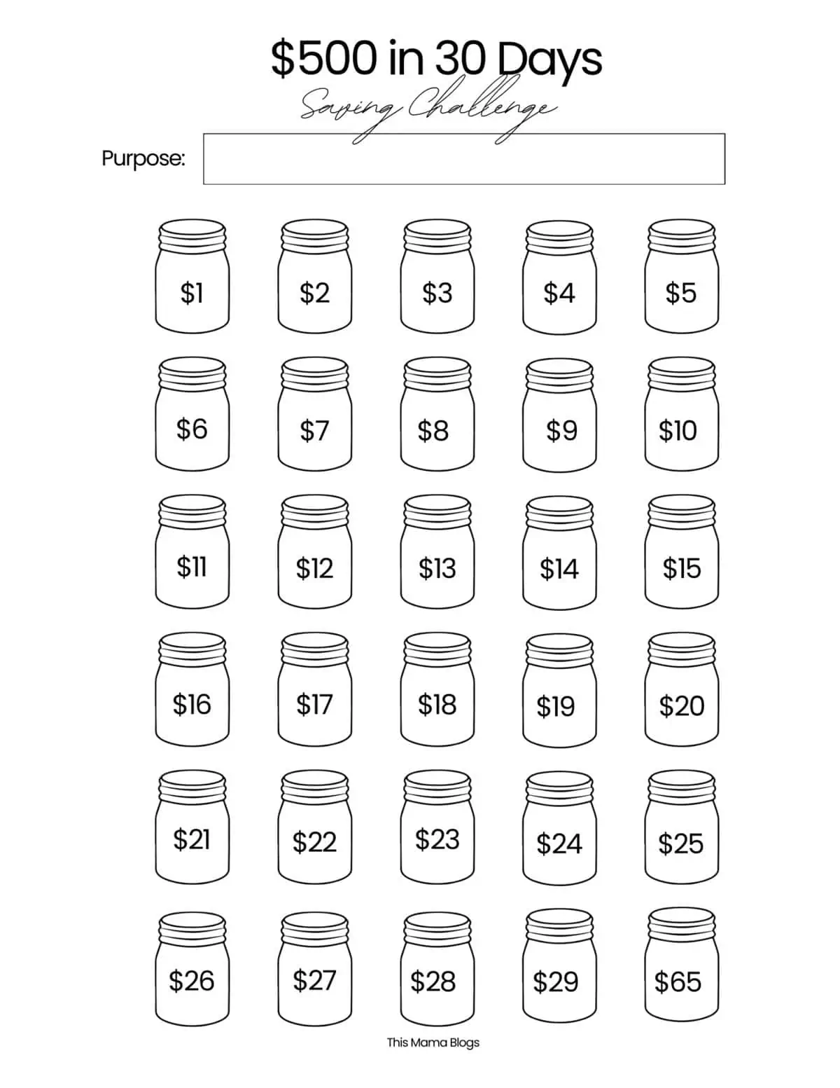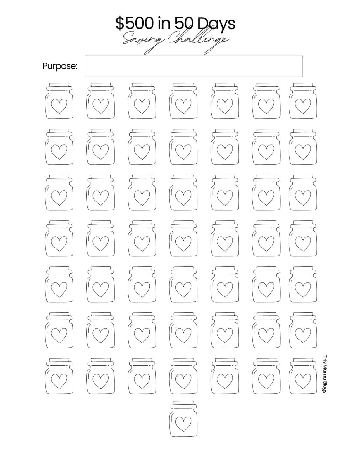 Para ajudá-lo a se manter organizado e motivado ao longo do caminho, você pode usar meu rastreador de economias para impressão gratuito. Cada dia você economiza seus $ 10, colorindo um frasco no rastreador. Observar esses potes sendo preenchidos é uma maneira divertida e encorajadora de ver seu progresso – e torna mais fácil saber exatamente onde você está em sua meta de US$ 500.