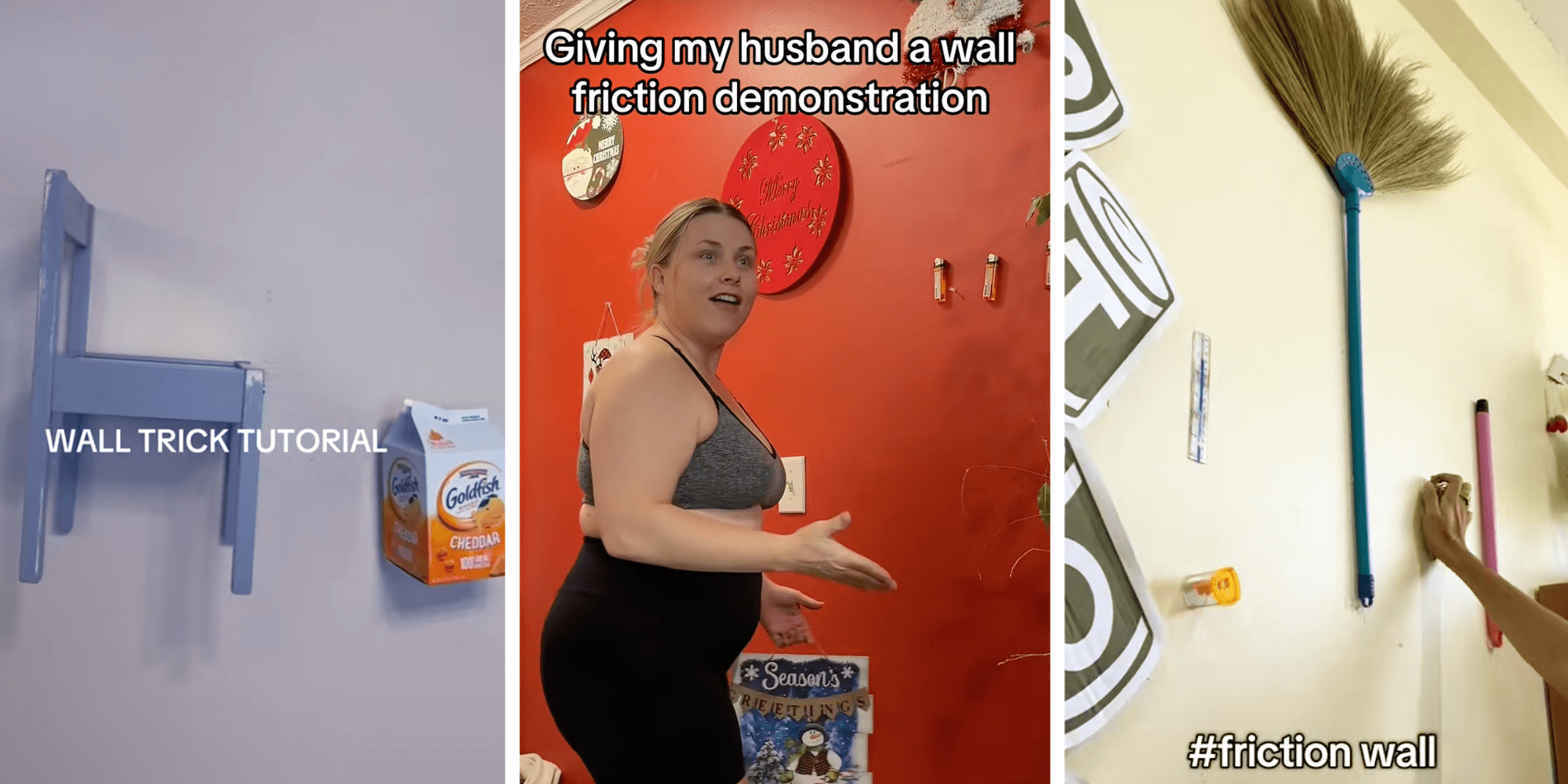 A profissional de fricção de parede @boredandinheat acumulou 13,4 milhões de visualizações com um vídeo demonstrando como ela colou um pequeno frasco de loção, uma barra de chocolate e uma grande caixa de biscoitos Goldfish na parede.