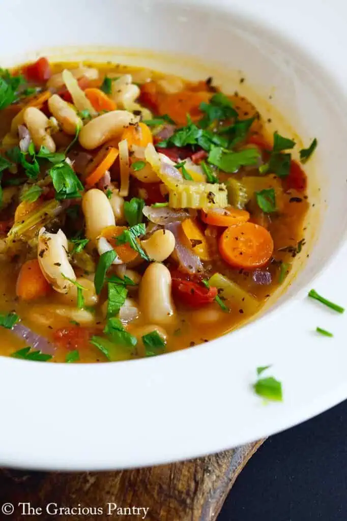 Repleta de vegetais e alimentos básicos para a despensa, esta sopa cria uma refeição farta e satisfatória com um orçamento limitado. É sem carne, nutritivo e cheio de sabor reconfortante. Compatível com fogão lento – perfeito para se aconchegar em uma noite fria sem complicações.