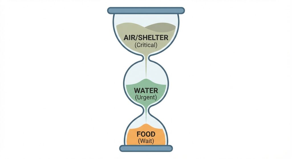 Observe que a comida é a última? As pessoas sempre ficam obcecadas com armadilhas e caça, mas você pode ficar com fome por muito tempo e ainda assim funcionar.