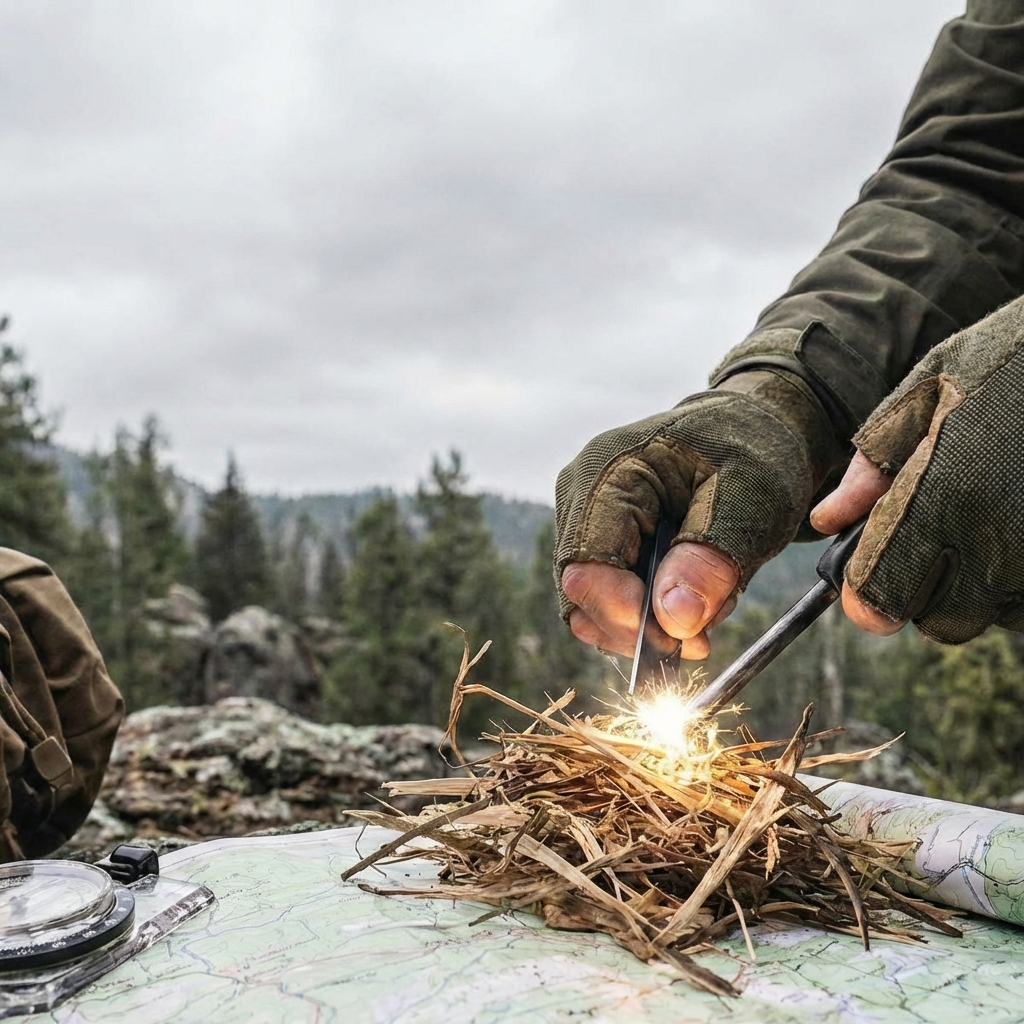 Se os isqueiros falharem (molhados, frios, sem combustível), um Haste de ferrocério (ferro rod) é seu melhor amigo. Ele lança faíscas a 3.000 graus e funciona mesmo quando molhado. Mas você precisa de “tinder” – material macio e seco, para capturar aquela faísca.